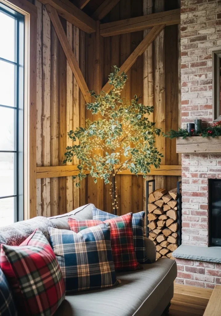 This cozy corner feels like the definition of rustic comfort. Warm wooden walls and exposed beams create that timeless farmhouse charm, while a softly glowing Christmas tree tucked beside a brick fireplace adds the perfect festive sparkle. The plaid pillows in shades of red and blue make the gray sofa look extra inviting, and the neatly stacked firewood gives the whole space that storybook cabin vibe. It’s the kind of room that practically whispers “hot cocoa and movie nights.”