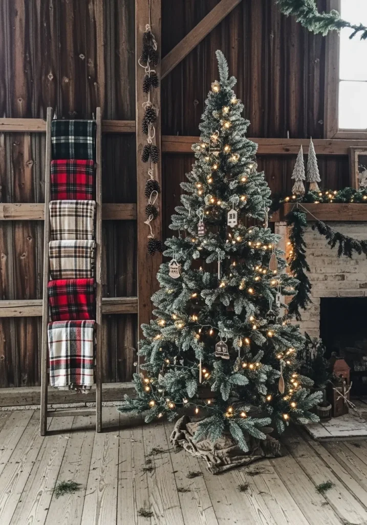 This rustic living space feels like the kind of place where hot cocoa tastes better just because the room itself radiates comfort. The wooden walls and floors have that perfectly weathered texture that only time can create, and the soft glow of the Christmas tree lights bounces gently off the natural tones. Simple ornaments shaped like tiny houses and trees keep the look grounded, while the pinecone garland and ladder draped with plaid blankets add layers of farmhouse coziness. Everything about this scene feels warm, real, and inviting, like a snapshot from a quiet countryside Christmas morning.