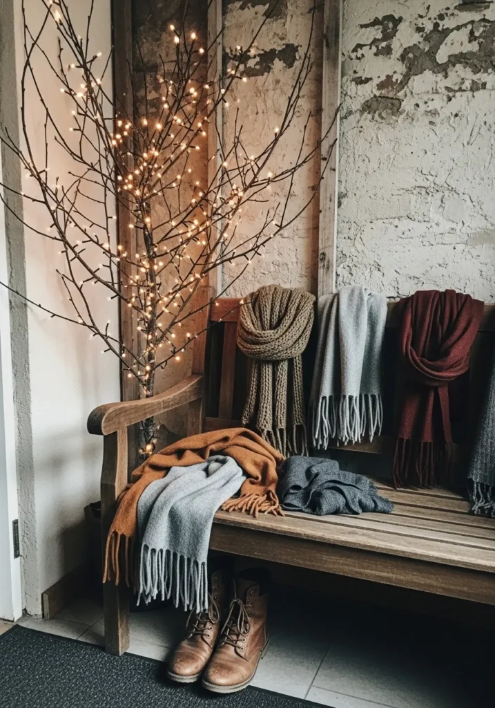 This rustic nook feels like the perfect welcome home moment after a chilly winter walk. A simple wooden bench sits against a weathered wall, draped with soft scarves in earthy tones of camel, taupe, gray, and brick red. The bare branch tree beside it twinkles softly with warm fairy lights, creating that understated farmhouse charm that feels both lived-in and effortlessly styled. A pair of worn leather boots tucked beneath the bench completes the look, adding just the right touch of cozy practicality.