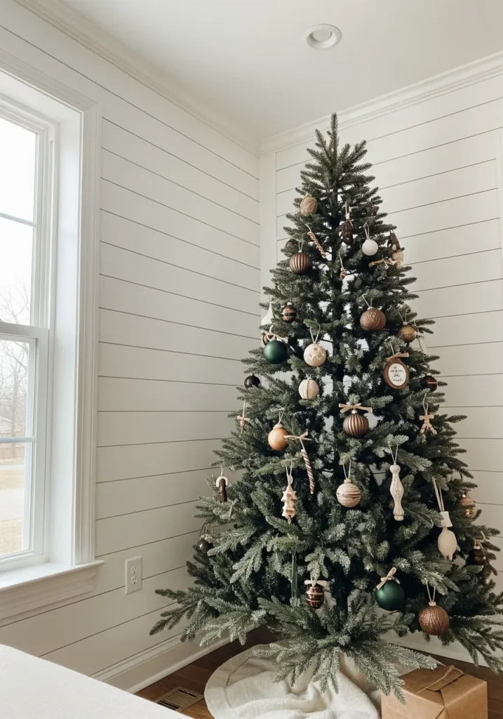 This Christmas tree captures that perfectly effortless farmhouse charm we all secretly wish came naturally. Set against clean white shiplap walls, the deep green branches feel even more striking, while the mix of earthy ornaments in brown, cream, and muted green tones keeps the look warm and grounded. A simple white tree skirt and a single wrapped gift complete the cozy picture, making it feel like a quiet December morning on a countryside porch.