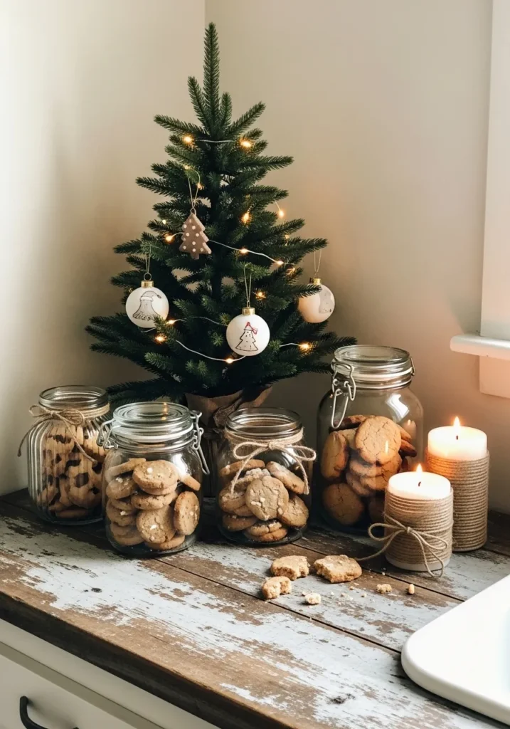 This adorable setup feels like it belongs in a storybook kitchen where sugar, spice, and everything nice come together. A petite evergreen tree sits proudly on a rustic wooden counter, wrapped in soft fairy lights and simple ornaments that look perfectly homemade. Around it, glass jars tied with twine brim with cookies of every kind, while a pair of glowing candles add the softest amber light. The combination of weathered wood, warm tones, and cozy textures makes this space feel like pure farmhouse comfort.