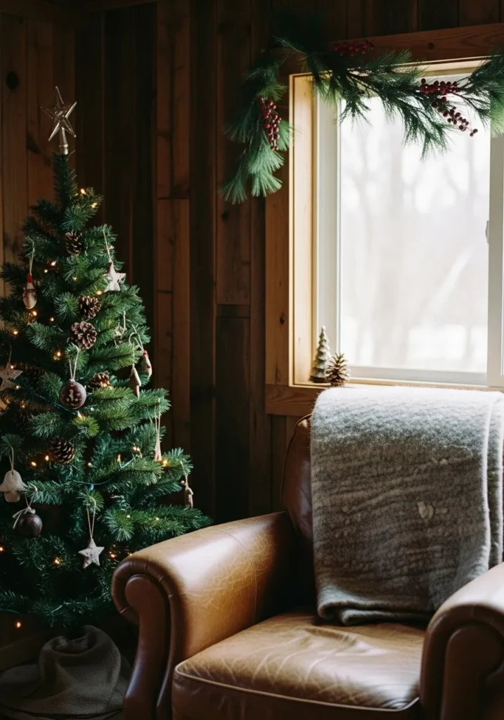 This space captures everything that makes a rustic Christmas feel magical. A simple pine tree twinkles softly beside a window trimmed with pine garland and red berries, while the wood-paneled walls give off that perfect log cabin warmth. The leather armchair, draped with a cozy gray throw, practically invites you to curl up with a mug of cocoa and watch the snow fall outside. Every detail feels effortless and real, from the burlap tree skirt to the little handmade ornaments of wood and twine.