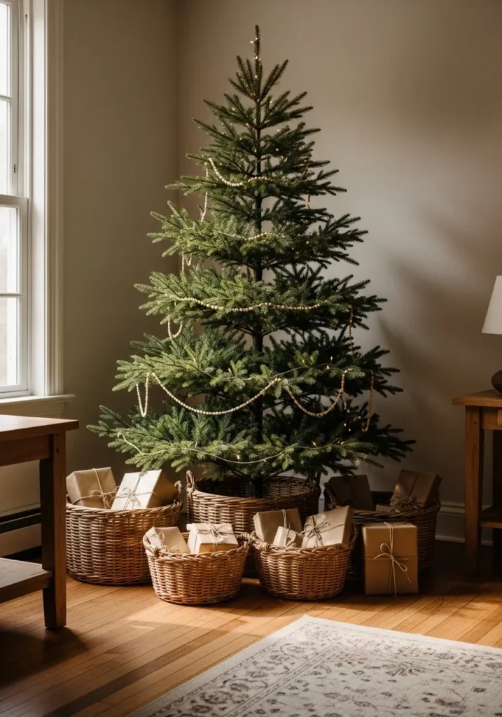 This design feels like the very essence of rustic Christmas—quiet, cozy, and beautifully uncomplicated. The tree is left mostly natural, adorned only with a delicate string of wooden beads and a few twinkling lights that catch the soft daylight streaming in through the window. Instead of a traditional tree skirt, woven baskets hold gifts wrapped in brown paper and twine, adding texture and warmth to the wooden floor. The space feels calm and inviting, with neutral walls and simple wooden furniture that let the greenery shine.