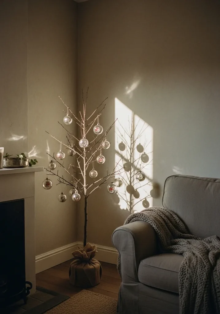 I love how this design proves that less really can be more. The sparse branches, the natural textures, and the gentle sunlight all come together to create such a peaceful vibe. It reminds me that Christmas doesn’t have to be about over-the-top decor. Sometimes all you need is a tiny tree, a bit of twine, and the quiet crackle of a fireplace to make a space feel magical.