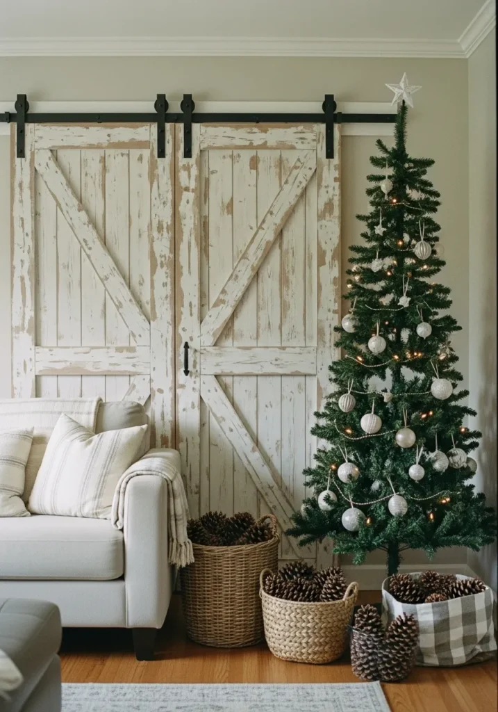 I absolutely love how this setup proves that simplicity can be so inviting. There’s something magical about pairing soft neutrals with natural materials like pinecones and wicker—it feels both calm and festive at the same time. I can easily imagine curling up here with a blanket and cocoa while the tree twinkles beside those beautiful barn doors. It’s understated, timeless, and oh-so-cozy.
