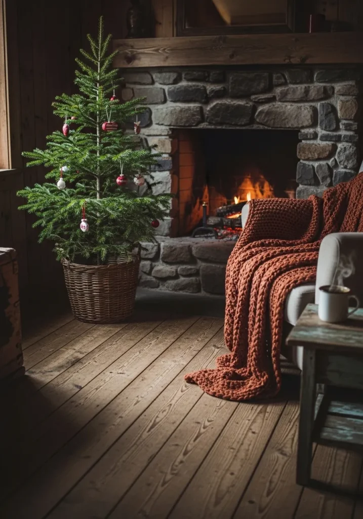 This cozy little setup feels like something straight out of a storybook. The small Christmas tree sits in a woven wicker basket beside a stone fireplace, its branches dotted with just a few red ornaments. The wooden walls add to that cabin-in-the-woods feeling, and the sunlight streaming through the window gives the space a soft, natural warmth that makes you want to curl up with a cup of cocoa and a fuzzy blanket. It’s rustic simplicity at its best—nothing flashy, just calm, homey comfort.