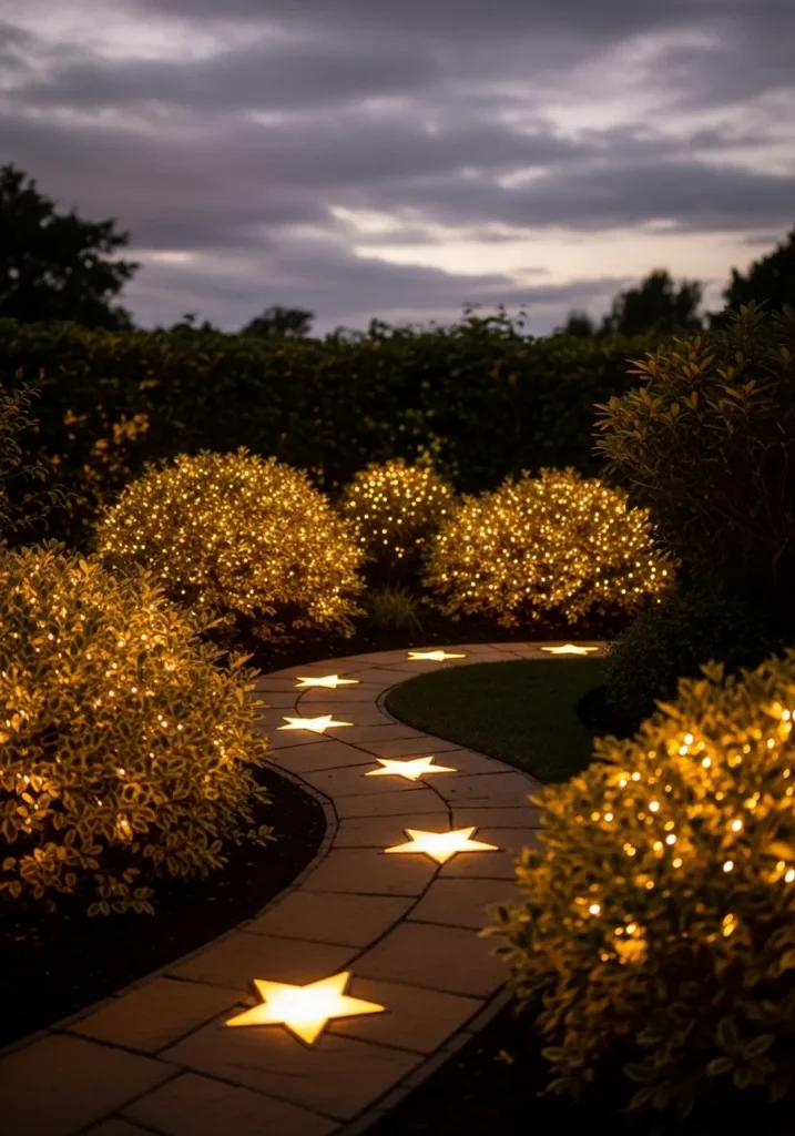 This charming backyard pathway looks like something straight from a holiday fairytale. The walkway winds gracefully through soft greenery, with glowing star-shaped lights set into the pavement that shimmer warmly against the night. The surrounding bushes sparkle with hundreds of tiny fairy lights, wrapping the garden in a golden glow that feels both whimsical and welcoming. It’s the kind of setup that makes every evening stroll feel like a scene from a cozy Christmas movie.