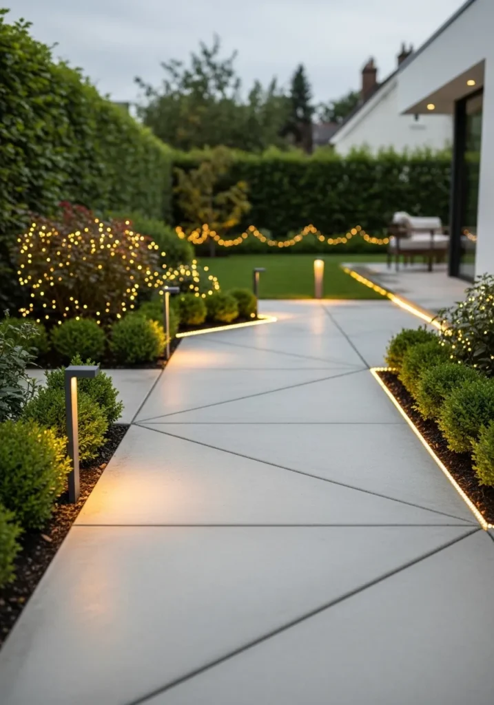 This sleek backyard design blends clean geometry with warm lighting that feels both elegant and effortless. The concrete pathway is laid out in crisp diagonal panels, perfectly bordered with soft garden greenery and subtle LED strips that trace the edges. Modern black post lights softly illuminate the walkway, while twinkling string lights draped along the bushes add a hint of holiday sparkle. The look is neat, minimal, and polished but still feels cozy and welcoming.