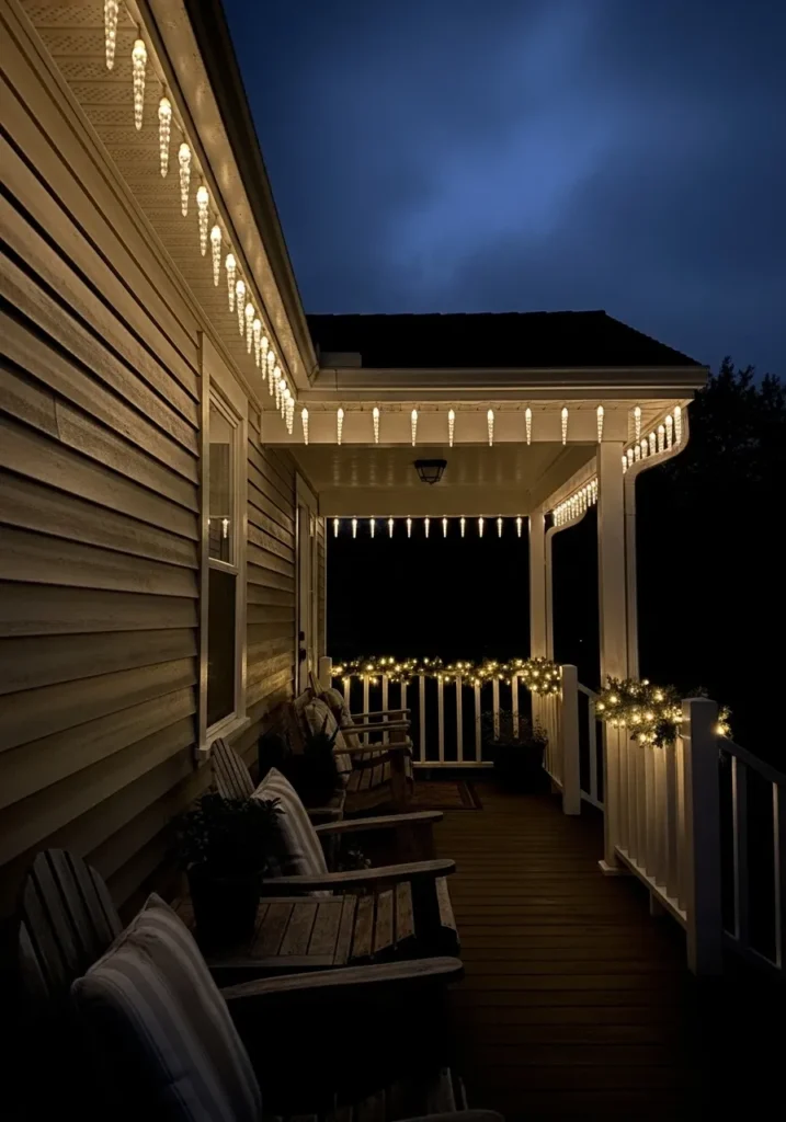This charming porch setup features warm white icicle lights tracing along the roofline, creating the prettiest shimmer against the night sky. The gentle glow cascades down like frozen drips of light, while the soft garland lights wrapped around the railing add a welcoming touch. Wooden chairs with cozy cushions line the porch, inviting you to sit back and soak in that magical winter calm.