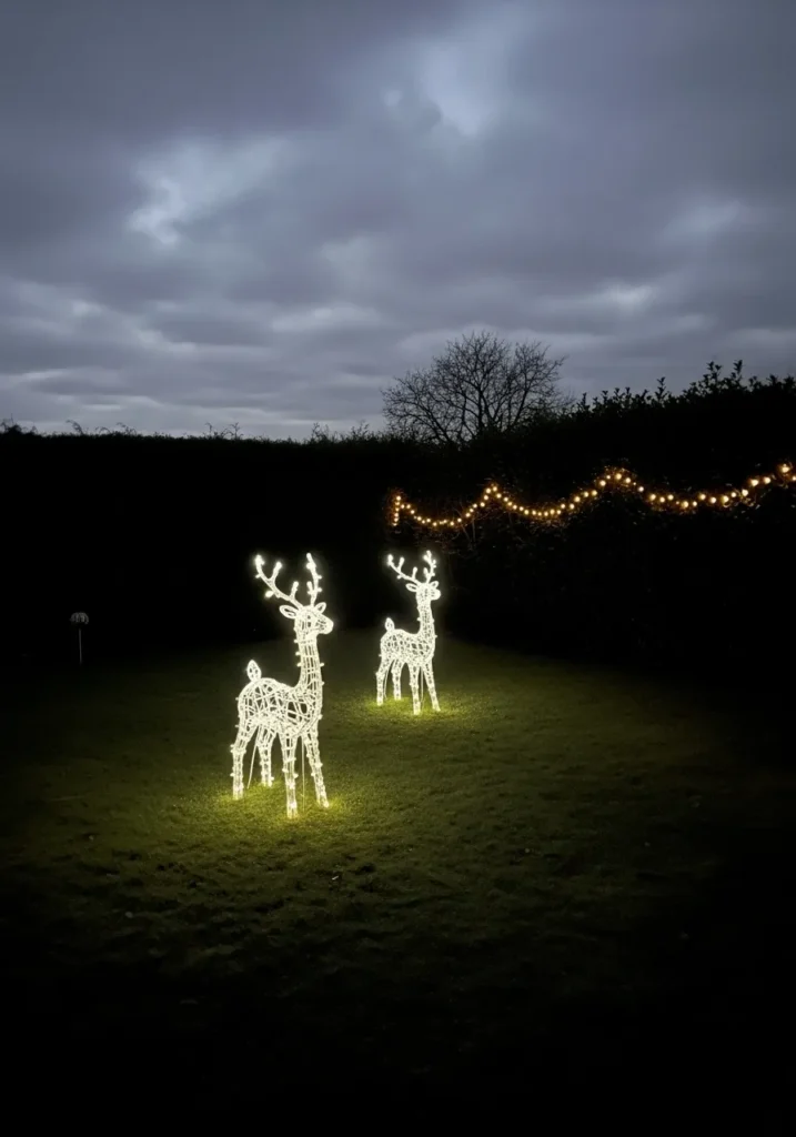 There’s something so quietly enchanting about this setup. Two glowing reindeer figures stand gracefully on a soft green lawn, their white lights casting a gentle halo that makes the whole yard feel like a Christmas fairytale. A simple string of golden bulbs draped along the hedge adds a warm backdrop, balancing the cool glow of the reindeer with a cozy touch. It’s minimal yet full of charm, letting the lights truly shine against the dark evening sky.