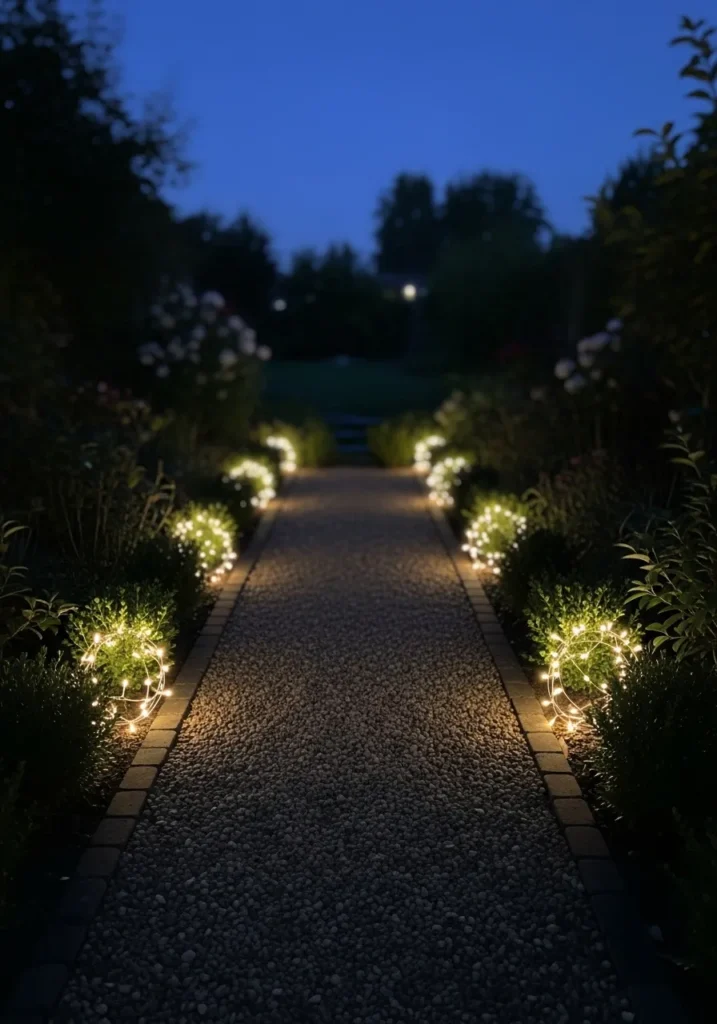 This charming garden pathway feels like something straight out of a Christmas fairytale. Pebbled stones lead the way through lush greenery, while warm fairy lights twinkle from low garden shrubs, creating a soft golden trail that feels cozy and inviting. The lights are arranged in gentle orbs that illuminate each step without being overpowering, making the whole path look magical against the deep blue evening sky.