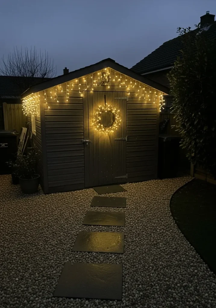 This cozy little shed steals the spotlight with its simple yet magical glow. Soft golden string lights trace the roofline like a twinkling crown, while a luminous wreath sparkles at the center of the door. The muted gray wood pairs perfectly with the warm white lights, creating that perfect balance between rustic charm and festive elegance. The stone pathway leading up to the door adds just the right touch of coziness, making the whole setup feel like a secret Christmas hideaway.