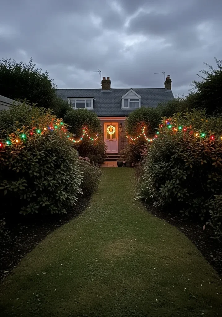 This charming cottage setup turns a simple garden path into a festive walkway that feels right out of a holiday movie. The hedges on each side are wrapped with classic multicolored bulbs that twinkle warmly against the moody evening sky. The string lights guide your eyes toward the cozy front door, where a glowing wreath greets visitors like a quiet promise of cocoa and laughter inside. The whole look balances simplicity and nostalgia, making it feel homey yet effortlessly magical.