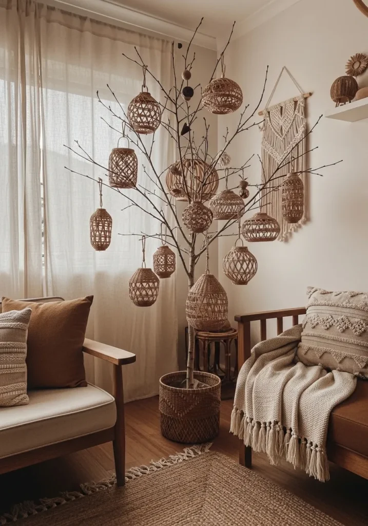 This cozy space feels like a warm hug from nature itself. A simple bare branch tree stands proudly in a woven basket, adorned with the loveliest collection of rattan and wicker ornaments. The neutral tones, from sandy beige to soft caramel, create a calm, earthy palette that pairs beautifully with the woven textures of the rug, throw, and pillows. The macramé wall hanging adds that perfect boho touch, tying the whole room together in a gentle, handcrafted harmony.