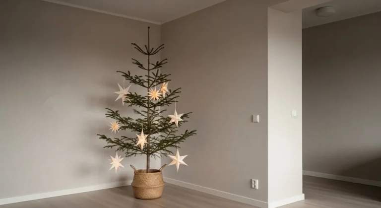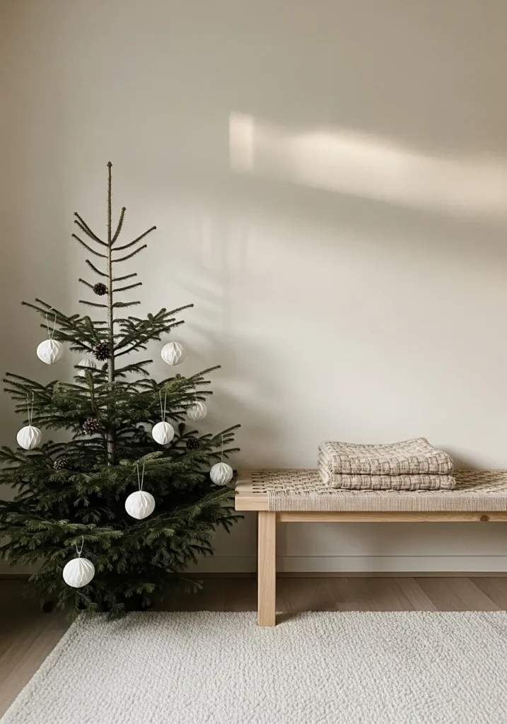 This design captures the magic of simplicity with a small evergreen tree dressed in just a few white paper ornaments and pinecones. The neutral tones of the woven bench and folded knit blankets add soft texture against the clean wall, creating that perfectly understated Scandinavian charm. It feels peaceful, natural, and beautifully effortless—like a quiet winter morning wrapped in wool.