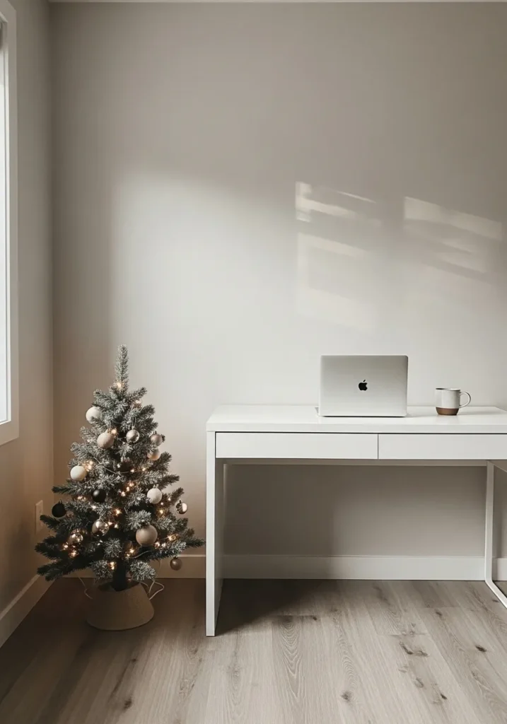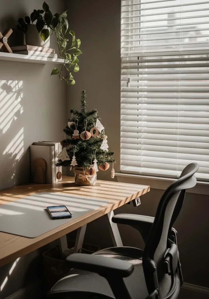 This space perfectly blends productivity with a touch of Christmas magic. A petite evergreen tree sits gracefully on a clean wooden desk, its simple handmade ornaments in neutral tones adding just the right amount of festive warmth. Soft daylight filters through the blinds, creating those dreamy stripe-like shadows that make even the most minimal setting feel inviting. The entire room feels calm, airy, and perfectly balanced between work and winter cheer.