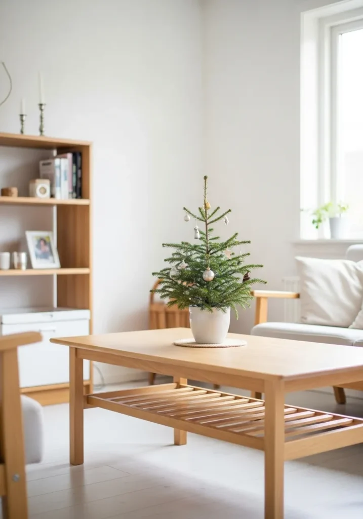 This minimalist living room is the perfect example of how less can truly be more. A small potted Christmas tree sits proudly on a light wood coffee table, its delicate ornaments adding just the right touch of holiday sparkle without overwhelming the space. The clean lines of the natural wood furniture, soft white walls, and gentle daylight streaming through the window create a calm, balanced setting that feels effortlessly Scandinavian. Every detail feels intentional yet relaxed, like a breath of fresh air wrapped in cozy simplicity.