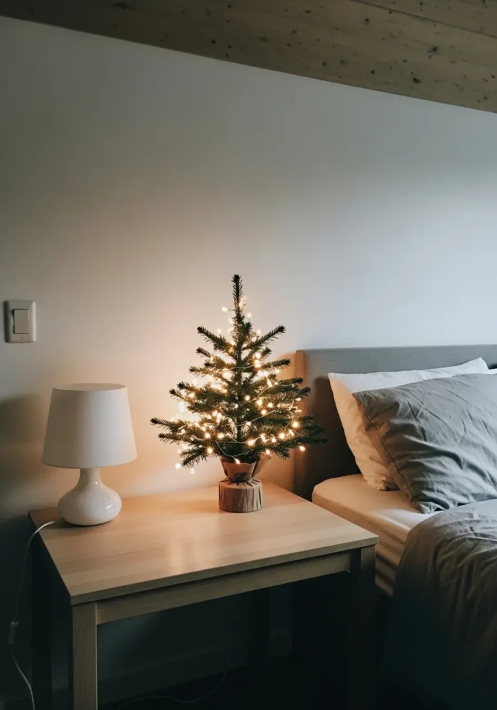 This cozy setup shows how less can truly be more. A small Christmas tree, wrapped in warm fairy lights, sits perfectly on a wooden bedside table beside a simple white lamp. The neutral bedding and soft lighting create such a calm, intimate feel that makes the whole space look effortlessly stylish. The natural wood tones and uncluttered layout keep the focus on the little tree, turning it into a tiny spotlight of festive charm.
