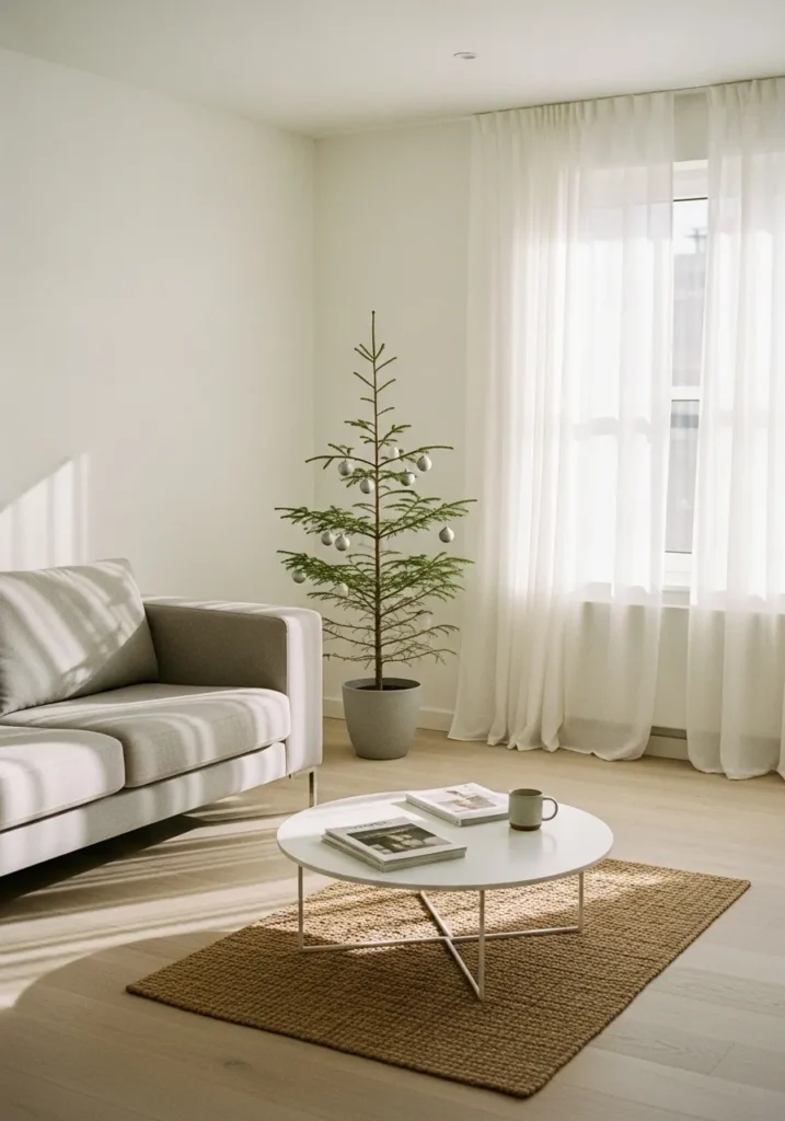 This living room feels like a breath of calm winter air. The soft light filters through sheer curtains, washing over pale wood floors and a cozy neutral sofa. The tiny potted evergreen stands quietly in the corner, its delicate branches holding just a handful of silver ornaments. Every piece in the room feels intentional—from the woven jute rug under the minimalist coffee table to the muted tones that create a peaceful, uncluttered atmosphere.