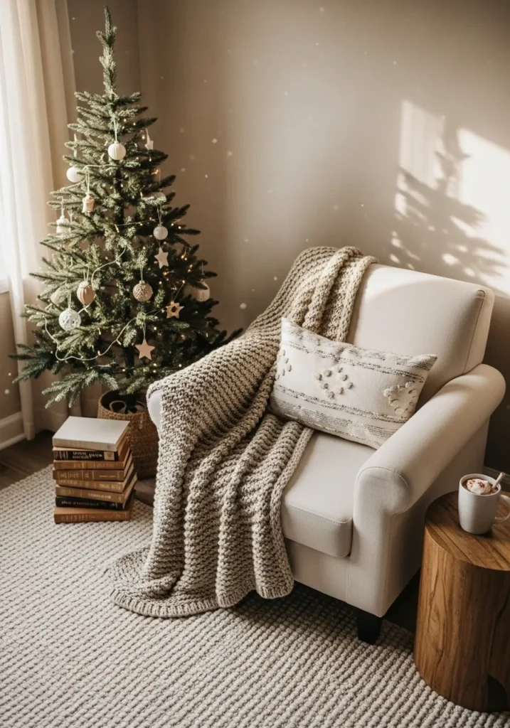 This room feels like the definition of calm Christmas charm. A small tree, simply decorated with soft gold and white ornaments, twinkles beside a cozy cream armchair layered with a chunky knit blanket and a textured cushion. A stack of old books adds that lived-in warmth, and the natural light pouring through the curtains gives everything a soft, golden glow. Even the little wooden side table and mug of hot cocoa make this corner feel effortlessly welcoming.