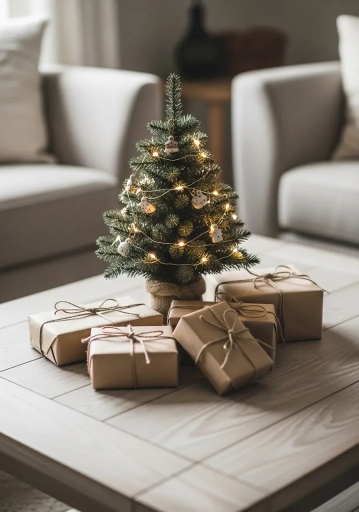 This cozy living room setup features the sweetest little Christmas tree perched right on a wooden coffee table. The tree is dressed in warm fairy lights and a few dainty ceramic ornaments, creating that soft twinkle we all crave in December. Its base is wrapped in rustic burlap, adding a natural texture that blends perfectly with the neutral-toned furniture around it. The simple brown-paper-wrapped gifts tied with twine complete the minimalist charm, proving that you don’t need a massive tree to make a big statement.