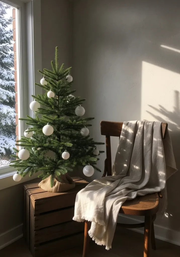 This cozy corner captures everything I love about minimalist Christmas decorating. A small evergreen tree sits gracefully on a rustic wooden crate, its branches sprinkled with perfectly round white ornaments. The sunlight from the nearby window casts soft, natural shadows, making the whole scene feel peaceful and timeless. The neutral tones of the wall, chair, and blanket blend beautifully with the simplicity of the tree, creating that serene “less is more” look that feels both elegant and effortless.
