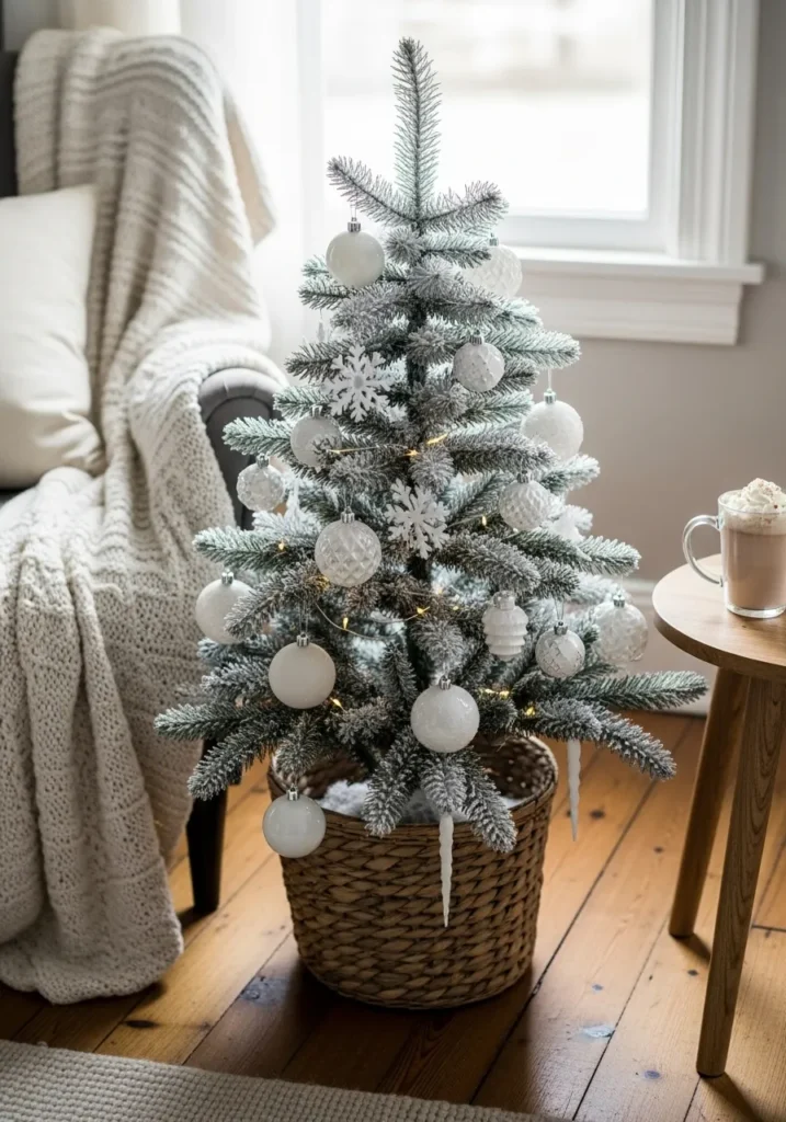 This little Christmas tree feels like the perfect blend of simple and magical. The frosted branches look freshly dusted with snow, and the matching white ornaments and snowflake decorations give it that soft, wintry charm without feeling overdone. I love how it’s placed in a woven basket instead of a traditional stand—it adds a touch of warmth and texture that balances the cool tones beautifully. The cozy throw blanket on the nearby chair and the cup of cocoa complete the whole peaceful, snowy-morning vibe.
