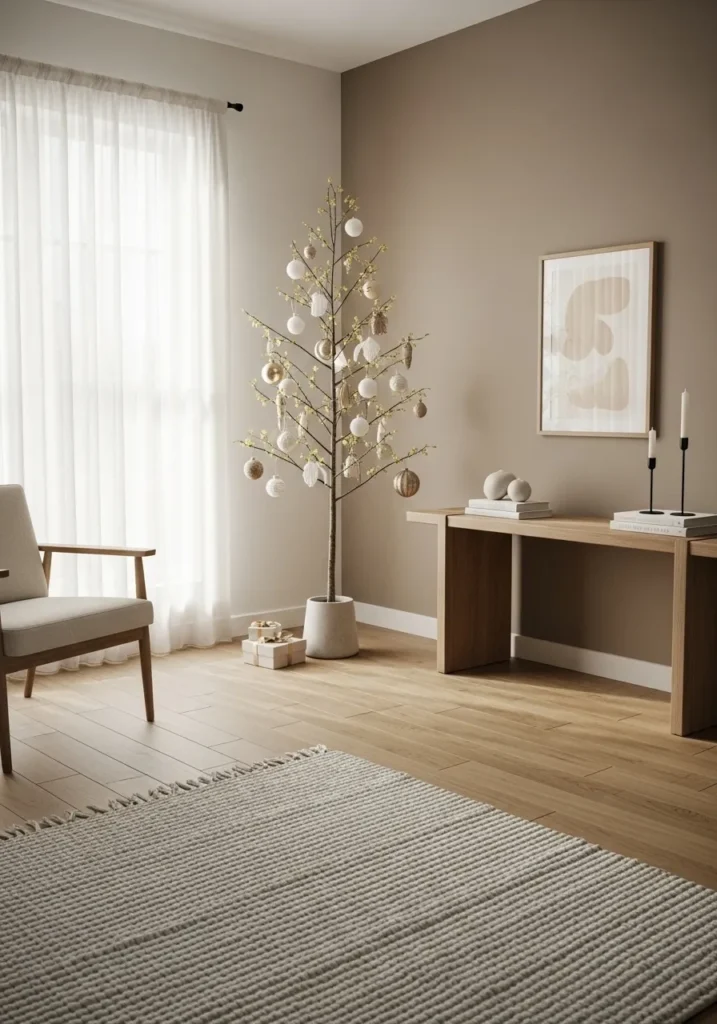 This minimalist space pairs soft neutral tones with a modern Christmas tree that feels as light and airy as the room itself. The slim tree, decorated with simple white and gold ornaments, stands gracefully beside a wooden console table and a cozy cream armchair. Natural light spills through sheer curtains, warming the tan walls and blonde wood floors. Every element feels intentional—from the textured rug underfoot to the perfectly wrapped gifts resting quietly at the base of the tree.