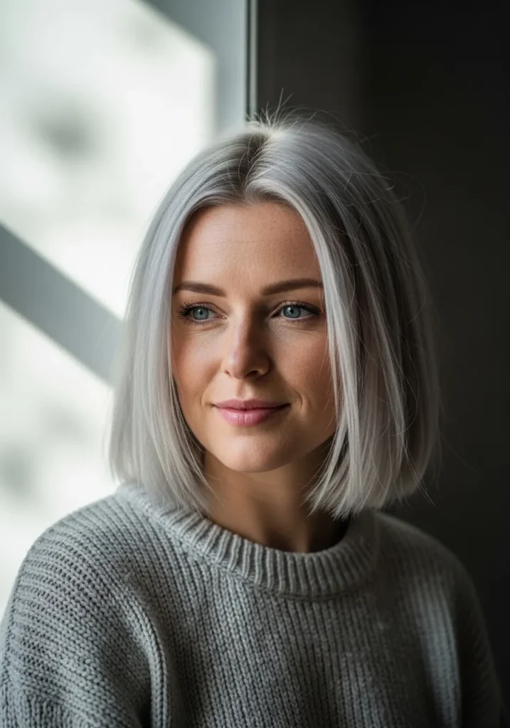 This chin length bob features a cool silver shade that looks luminous near the window light. The cut stays straight with no layers which keeps the shape clean and simple. The hair has a smooth texture with small flyaways that make it feel natural and effortless.