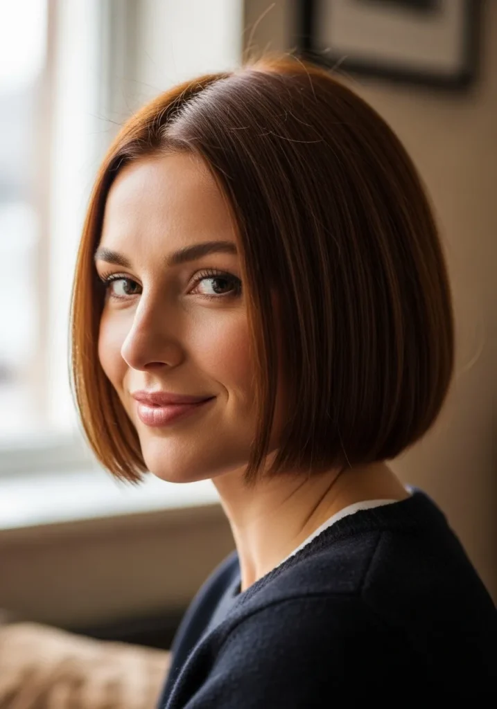 This chin length bob has a warm chestnut tone that feels rich and natural. The blunt edge frames the jaw gently and the hair sits smoothly with just a hint of softness near the ends. The center part keeps the look simple and neat.