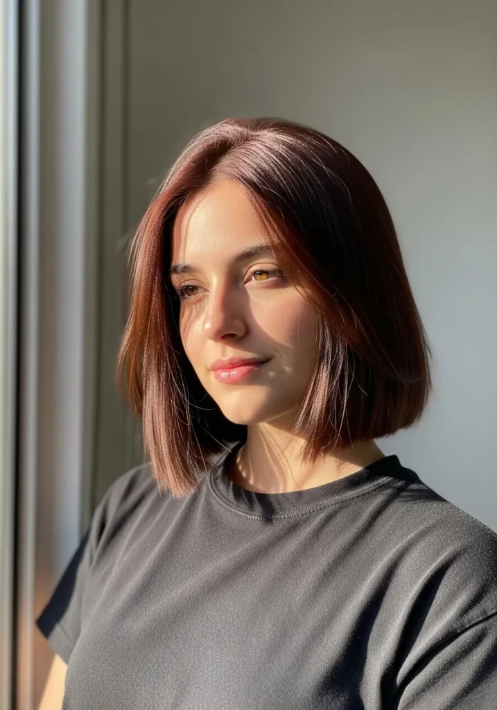 This bob lands at the jawline with a shiny chestnut brown tone that glows in the sunlight. The blunt ends stay even and the hair falls neatly on both sides with a smooth finish. The center part keeps the style looking balanced and tidy.