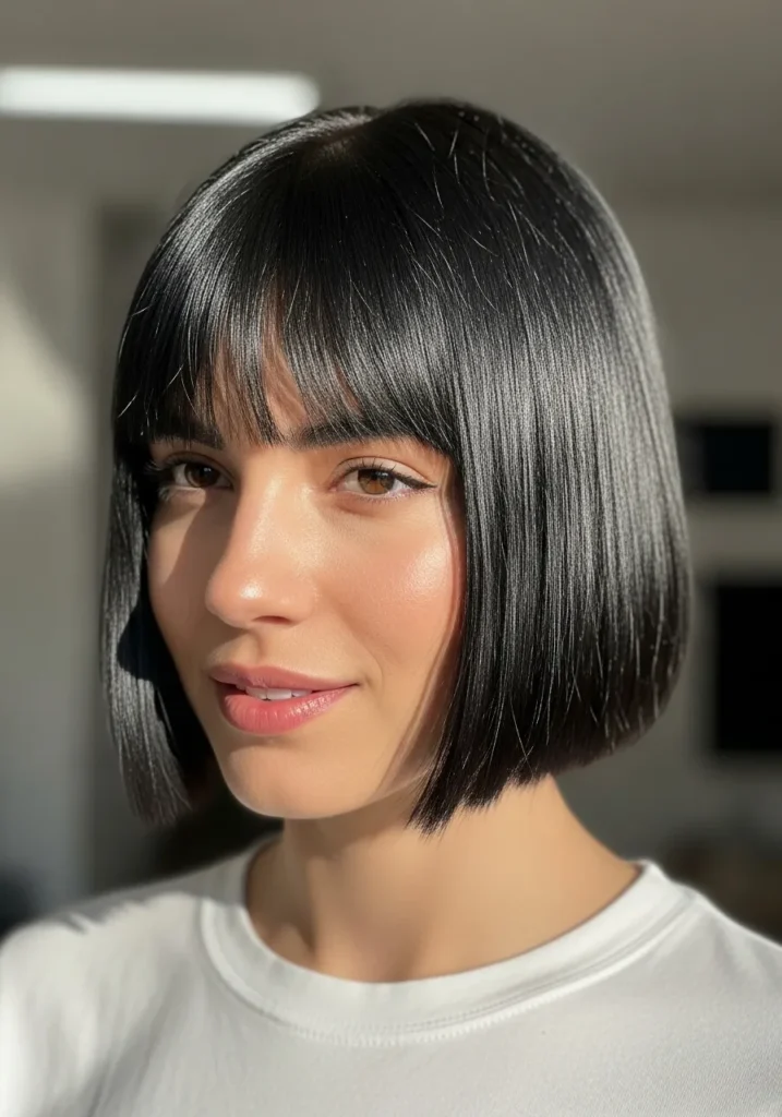 This straight blunt bob has a glossy black shade and short baby bangs that add a cute and modern touch. The length sits right at the chin and the sleek finish keeps the outline crisp.
