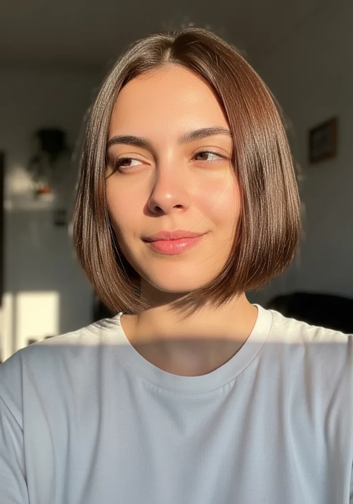 This short bob falls just under the chin with a soft brown color that looks warm in the sunlight. The blunt edge keeps the shape defined while the texture stays smooth and natural.
