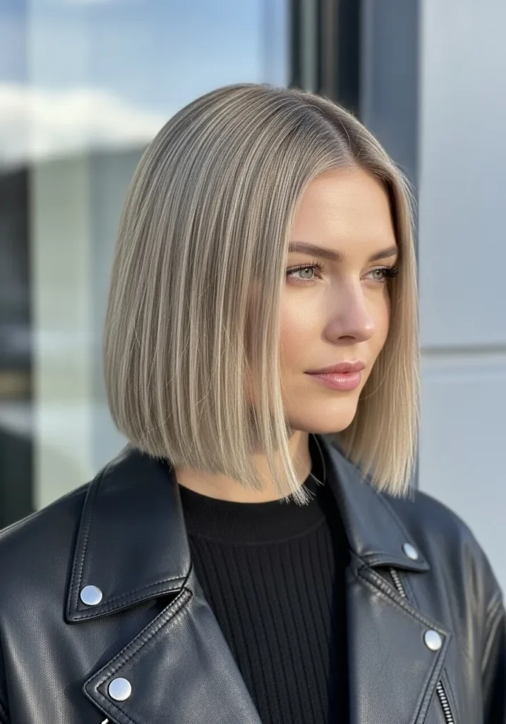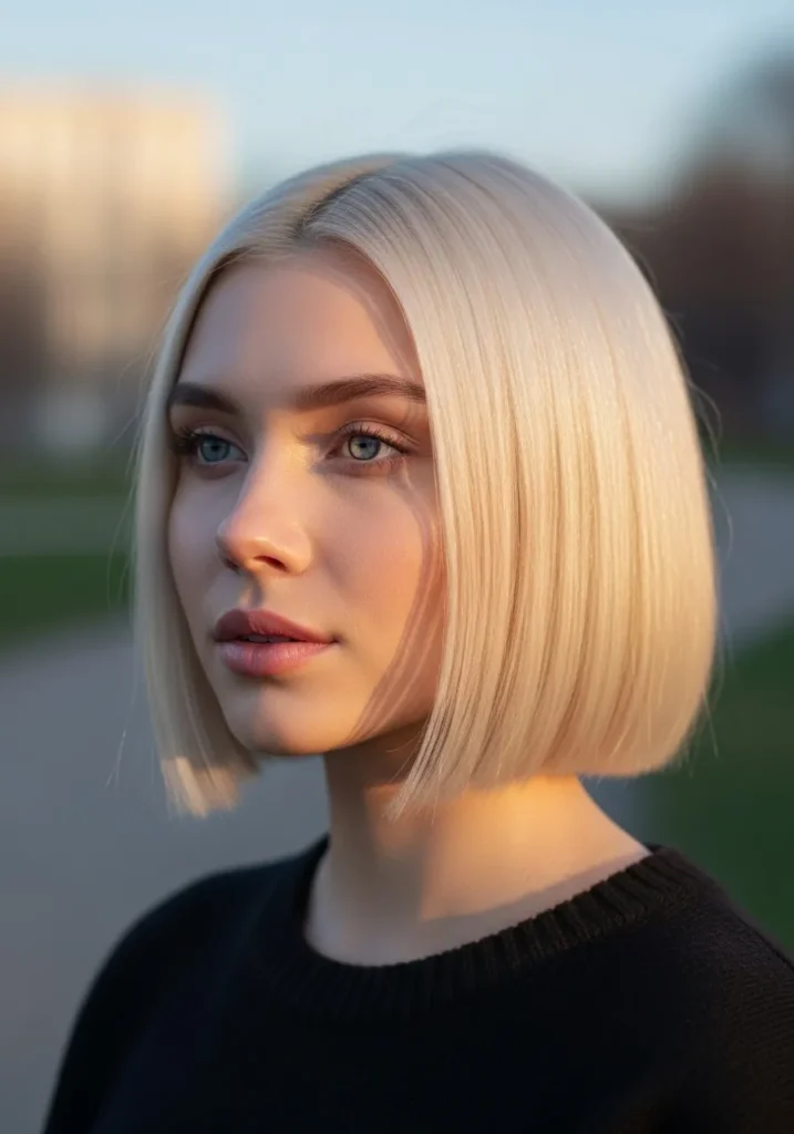 This blunt cut sits right at the chin with a smooth and silky ash blonde tone that looks bright without feeling harsh. The strands fall in a straight line that keeps the shape neat and modern while the center part keeps everything balanced.