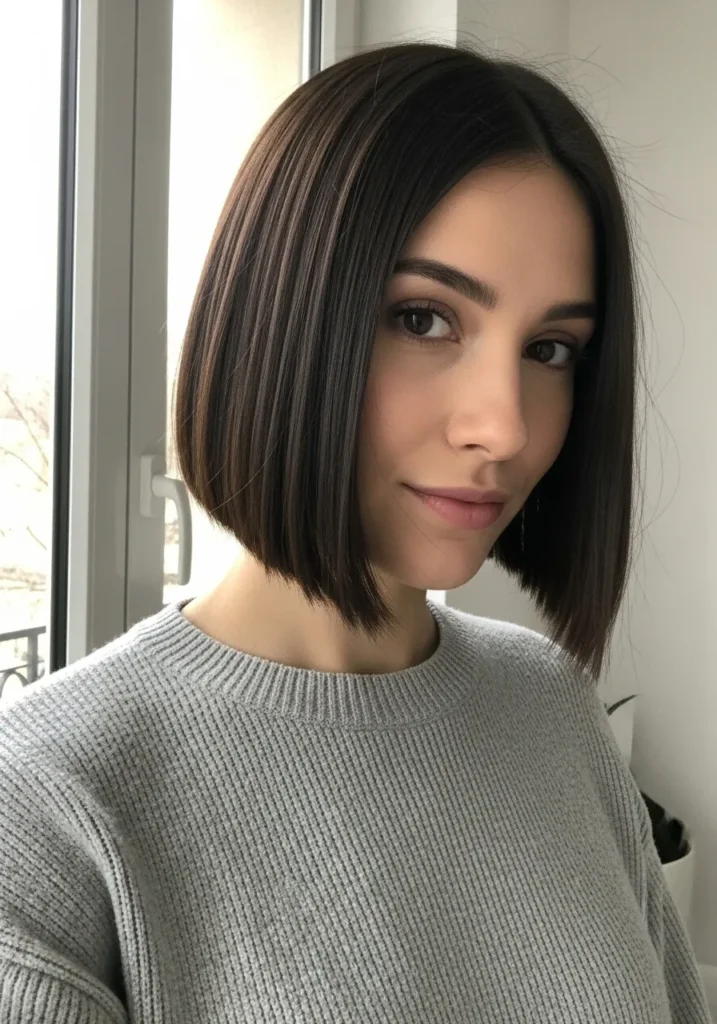This style features a straight bob trimmed evenly at chin level with a deep chocolate tone that looks glossy in natural light. The hair falls smoothly with no layers which gives the shape a strong outline. The simple part and soft shine make the whole look feel clean.
