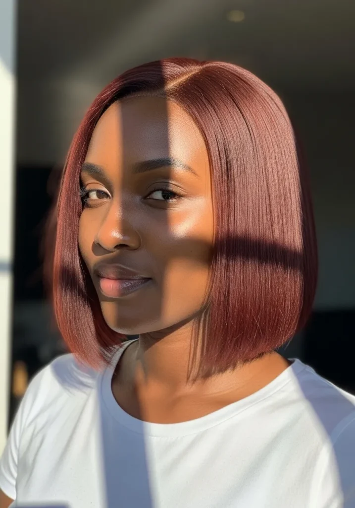 This bob rests just under the chin in a warm copper shade that shines in the sun. The strands fall smoothly with a clear blunt edge that keeps the cut looking modern. The center part opens the face and the natural hair texture shows through.