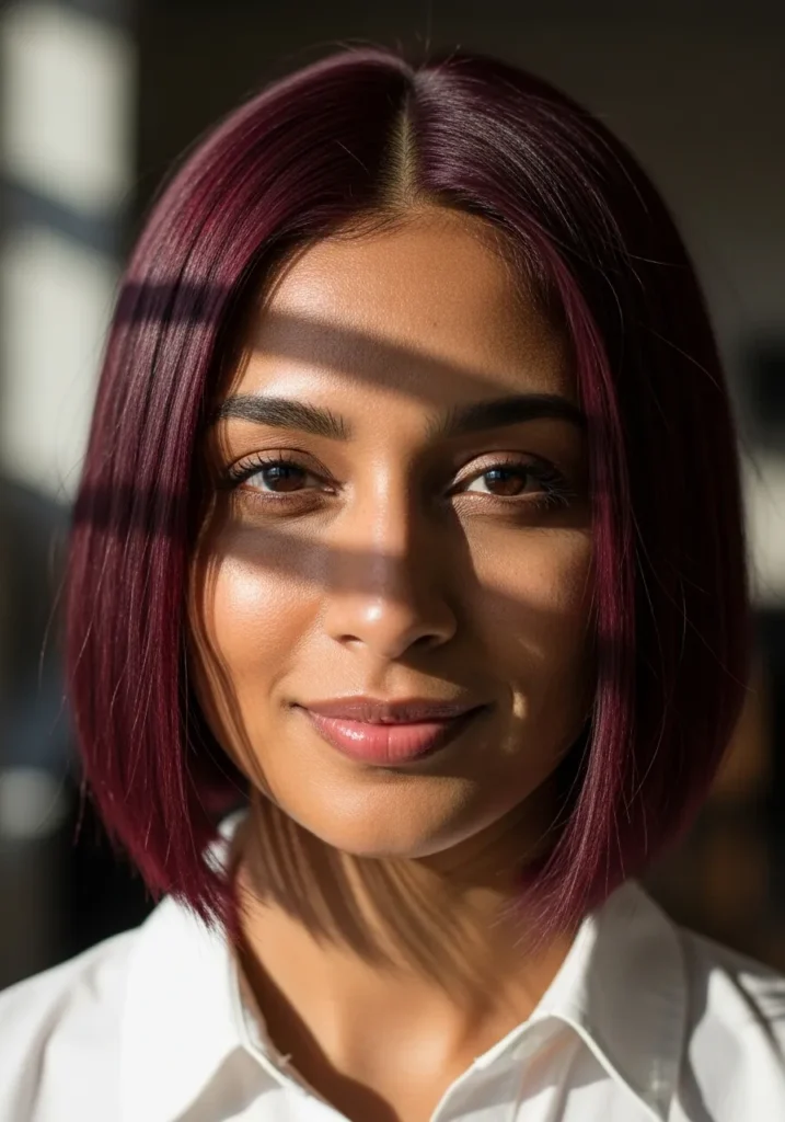 This sleek bob hits at the chin with a sharp blunt cut that keeps the outline crisp. The deep berry color looks rich and saturated and the sunlight brings out a soft shine. The hair stays smooth with a clean center part that highlights the symmetry of the cut.