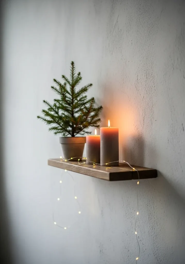 This small-space setup captures the pure magic of simplicity. A single wooden floating shelf holds a tiny potted evergreen and a pair of soft gray candles, their gentle flames reflected against a textured wall. The subtle string lights drape gracefully down, adding just a touch of golden sparkle without overwhelming the scene. It’s calm, uncluttered, and feels like the perfect little nod to Christmas in a modern apartment.