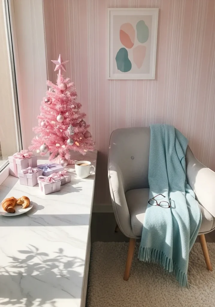 This dreamy little setup feels like a scene straight out of a pastel Christmas movie. A soft pink mini tree sits on a marble-topped windowsill, dressed in blush and silver ornaments that sparkle under the natural sunlight. Below it, neatly wrapped pastel gifts add to the dainty charm, while a nearby armchair with a mint throw and a cozy cup of coffee makes it the ultimate nook for slow mornings and warm croissants. The blush-striped wallpaper ties everything together for that picture-perfect feminine touch.