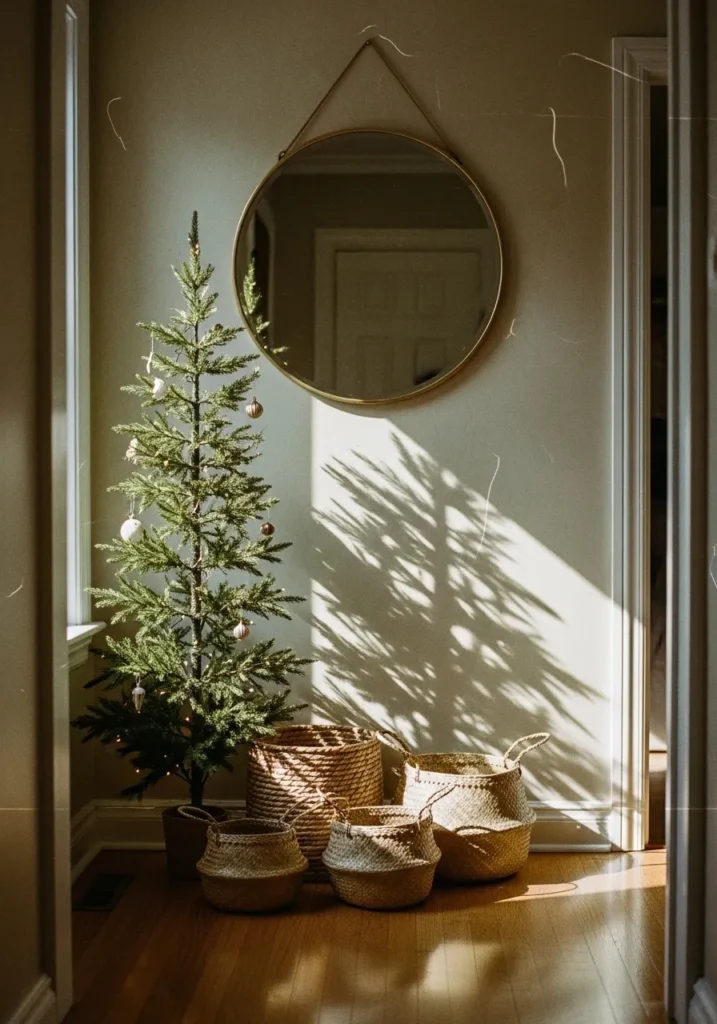 This cozy little corner proves that you don’t need much space to create holiday magic. A slim, natural-looking Christmas tree stands beside a sunlit wall, decorated with just a few delicate ornaments. The woven baskets at the base bring soft texture and warmth, while the round mirror above gently reflects the glow of afternoon light. The whole setup feels airy and uncluttered, perfect for anyone who loves understated, organic style.