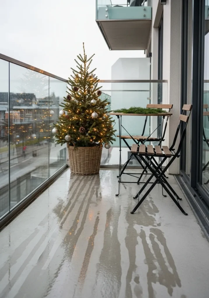 I absolutely love how this design proves that you don’t need a huge living room to feel festive. The natural basket adds such a charming rustic contrast to the modern balcony, and those lights reflecting off the wet floor are pure winter romance. It’s simple, elegant, and perfectly city-chic — like your own little Christmas escape above the bustle.