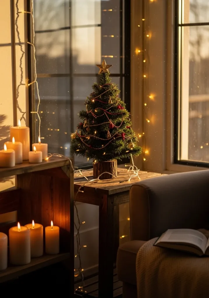 I absolutely love how this design feels like a quiet hug after a long day. The combination of the tiny tree, the candlelight, and that golden-hour window glow makes the whole room feel like it’s wrapped in a cozy blanket. It’s the kind of setup that makes me want to sip hot cocoa, turn on a Christmas playlist, and forget about the world for a while. It’s small-space decorating done perfectly—effortless, charming, and full of heart.