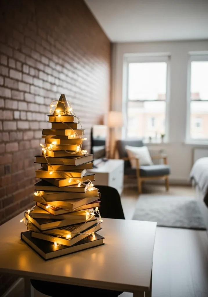 This clever little setup turns a pile of books into a whimsical Christmas tree, proving that small spaces don’t mean skipping on creativity. The stacked novels form a charming tree shape, wrapped in warm fairy lights that give off the coziest amber glow. Against the exposed brick wall and minimalist apartment backdrop, the look feels effortlessly modern yet inviting. It’s a festive nod to personality and imagination, perfect for anyone whose bookshelf is already their best décor.