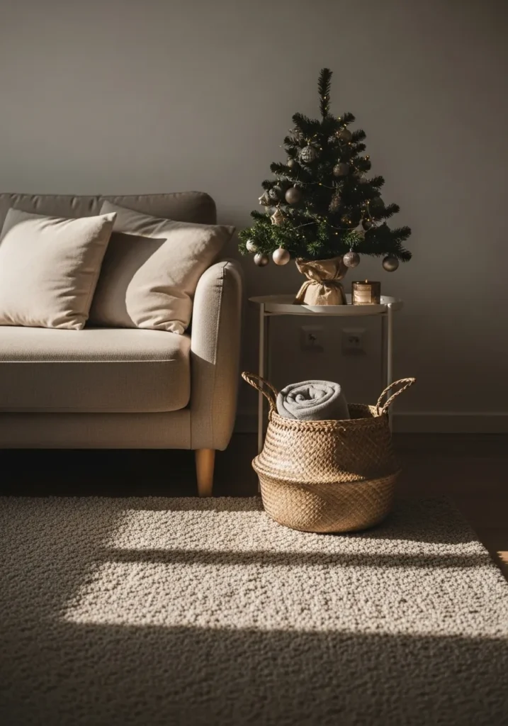 I absolutely adore how peaceful this scene feels. The sunlight, the greenery, the woven details—it’s like a quiet morning wrapped in calm and coffee aroma. I love that it celebrates simplicity instead of excess, showing that even a small tree can make a home feel festive and grounded at the same time. It’s minimalist, yes, but in the most heartwarming way.