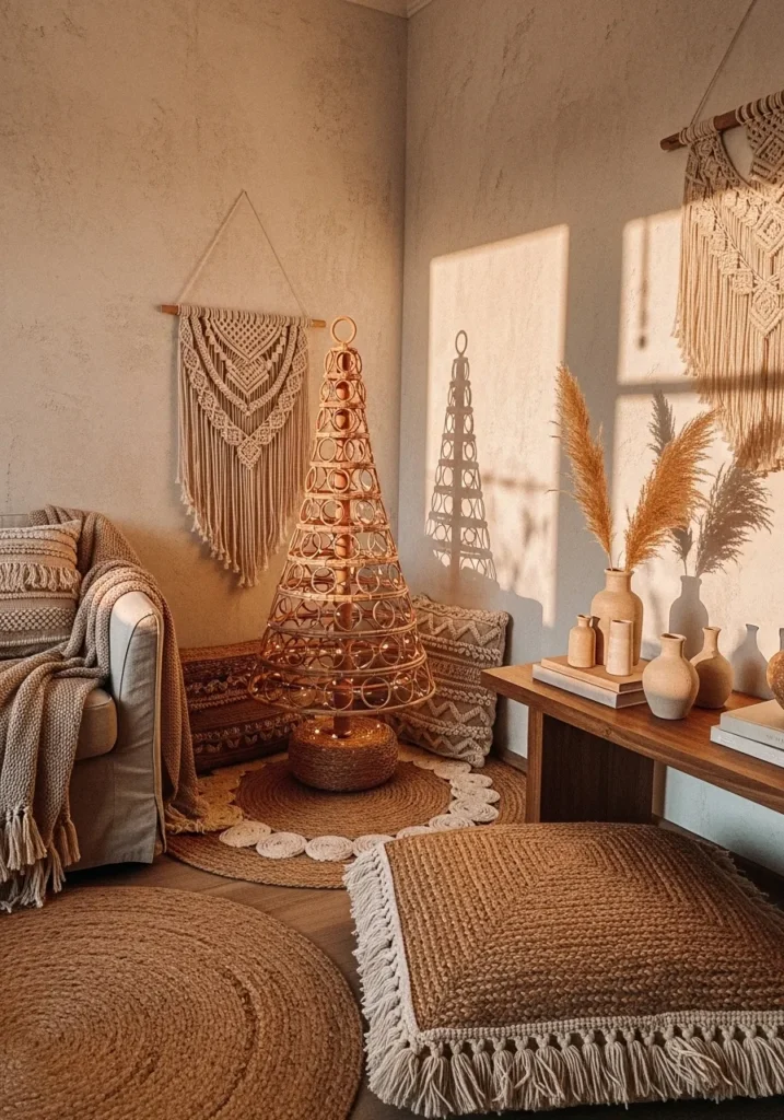 This cozy little nook feels like a warm hug on a winter morning. The soft beige walls, macrame wall hangings, and woven textures wrap the room in a soothing bohemian glow. The Christmas tree itself is a stunning rattan masterpiece—light, airy, and perfect for small spaces. Set atop a woven base and surrounded by jute rugs and fringed pillows, it blends right in with the natural tones while still adding a festive sparkle through the subtle warm lights woven inside its rings.