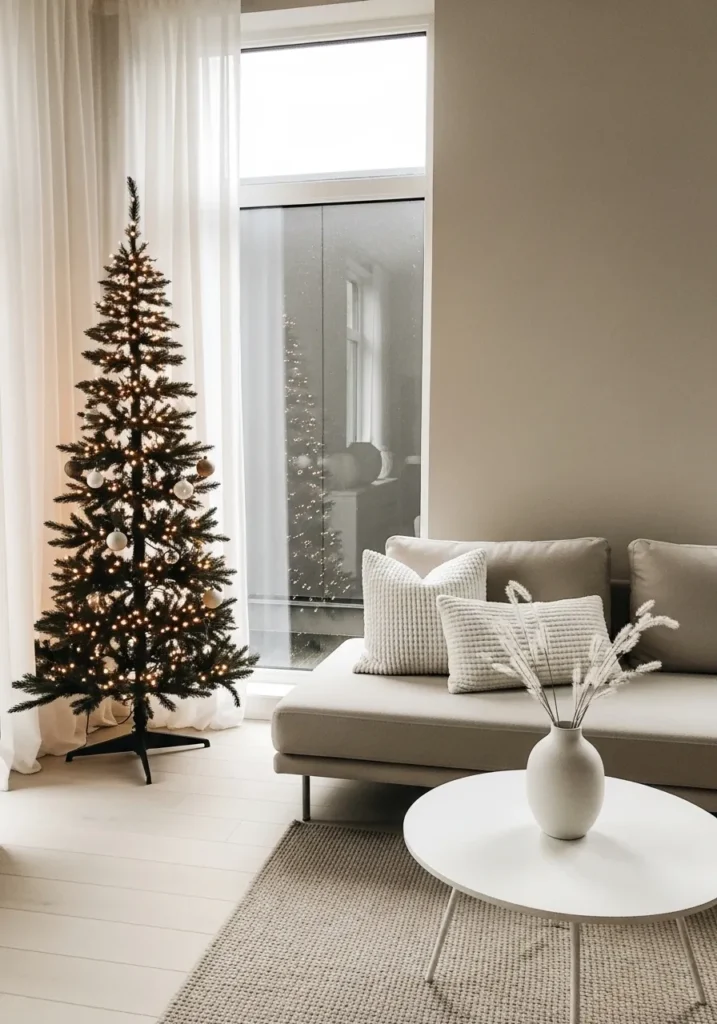 This small apartment design embraces a soothing palette of creams and taupes, with every detail radiating calm simplicity. The slim Christmas tree fits neatly beside sheer white curtains, its warm fairy lights twinkling softly against the neutral walls. A compact sofa in beige tones is dressed with textured throw pillows, while a minimalist white coffee table holds a simple ceramic vase. Everything feels intentional and uncluttered, proving that you don’t need a grand space to create serene holiday charm.