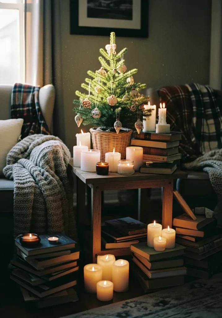 This tiny Christmas tree setup feels like a warm hug on a chilly December evening. The mini evergreen sits perfectly in a woven basket, resting atop a wooden side table surrounded by stacks of books and glowing candles. Soft plaid throws and chunky knit blankets spill over nearby armchairs, creating a snug little nook that’s equal parts festive and peaceful. Every detail—from the simple handmade ornaments to the flicker of candlelight—adds to the dreamy, storybook charm that makes small-space living feel extra magical during the holidays.