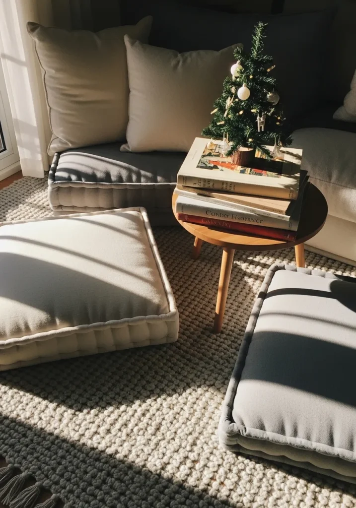 This warm little nook is the kind of space that makes you want to kick off your shoes and stay awhile. The neutral color palette, soft floor cushions, and chunky knit rug create a calm and inviting atmosphere, while the mini Christmas tree perched on a stack of books adds just the right touch of festive charm. The sunlight streaming through the window highlights the textures beautifully, from the plush cushions to the natural wood table, giving the room that effortless “Sunday morning” feel.