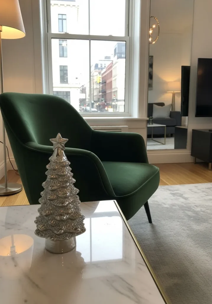 This cozy apartment corner feels like the perfect mix of city sophistication and quiet holiday charm. The deep green armchair adds a beautiful pop of color against the soft neutral tones of the room, while the modern marble coffee table keeps everything sleek and refined. Sitting right on top, a small silver Christmas tree sparkles with understated glamour, proving that you don’t need a full-sized tree to bring the Christmas spirit home. With natural light streaming through the tall window and a subtle reflection in the mirror, this space feels calm, stylish, and perfectly balanced.
