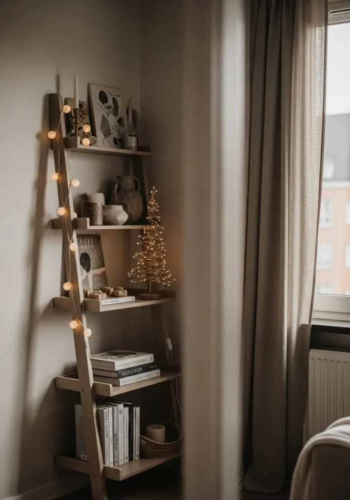 This cozy nook proves that even the tiniest corner can hold a little holiday sparkle. A wooden ladder shelf leans effortlessly against the wall, dressed with soft fairy lights and a miniature wire Christmas tree that glows gently like a quiet whisper of festive cheer. The shelves are styled with neutral-toned pottery, art prints, and stacked books that add layers of warmth and texture without cluttering the space. The soft beige curtains and diffused daylight give the whole corner a calm, Scandinavian feel that feels both modern and timeless.